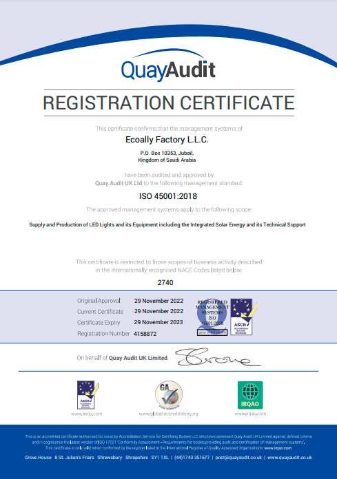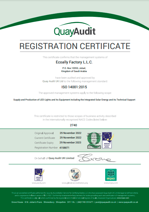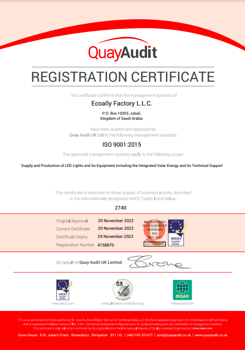 At Ecoally, these accreditations are a testament to our relentless pursuit of excellence. They offer our clients the assurance that they are partnering with a company that upholds strict quality standards, prioritizes environmental sustainability, and places the utmost importance on the safety and welfare of its employees and customers. With these certifications, we reinforce our position as a trusted operator in the lighting and solar industry, providing you with innovative solutions that meet the highest industry standards.